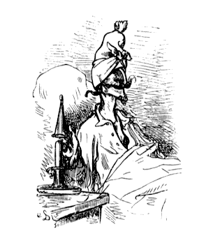 Als wir drei Tage umhergesegelt waren, der Himmel weiß wo - denn wir hatten noch immer keinen Kompaß -, kamen wir in eine See, welche ganz schwarz aussah. Wir kosteten das vermeinte schwarze Wasser, und siehe, es war der vortrefflichste Wein. Nun hatten wir genug zu hüten, daß nicht alle Matrosen sich darin berauschten. - Allein die Freude dauerte nicht lange. Wenige Stunden nachher fanden wir uns von Walfischen und andern unermeßlich großen Tieren umgeben, unter denen eines war, dessen Größe wir selbst mit allen Fernröhren, die wir zu Hülfe nahmen, nicht übersehen konnten. Leider wurden wir das Ungeheuer nicht eher gewahr, als bis wir ihm ziemlich nahe waren; und auf einmal zog es unser Schiff mit stehenden Masten und vollen Segeln in seinen Rachen zwischen die Zähne, gegen die der Mast des größten Kriegsschiffes ein kleines Stöckchen ist. Nachdem wir einige Zeit in seinem Rachen gelegen hatten, öffnete es denselben ziemlich weit, schluckte eine unermeßliche Menge Wasser ein und schwemmte unser Schiff, das, wie Sie sich leicht denken können, kein kleiner Bissen war, in den Magen hinunter. Und hier lagen wir nun so ruhig, als wenn wir bei einer toten Windstille vor Anker lägen. Die Luft war, das ist nicht zu leugnen, etwas warm und unbehaglich. - Wir fanden Anker, Taue, Boote, Barken und eine beträchtliche Anzahl Schiffe, teils beladene, teils unbeladene, die dieses Geschöpf verschlungen hatte. Alles, was wir taten, mußte bei Fackeln geschehen. Für uns war keine Sonne, kein Mond und keine Planeten mehr. Gewöhnlich befanden wir uns zweimal des Tages auf hohem Wasser und zweimal auf dem Grunde. Wenn das Tier trank, so hatten wir Flut, und wenn es sein Wasser ließ, so waren wir auf dem Grunde. Nach einer mäßigen Berechnung nahm es gemeiniglich mehr Wasser zu sich, als der Genfer See hält, der doch einen Umfang von dreißig Meilen hat.