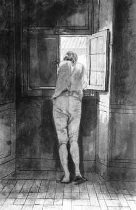 Goethe am Fenster seiner Wohnung in Rom. Tuschezeichnung von Tischbein
