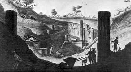 Ausgrabung des Isistempels in Pompeji. Radierung nach Fabris