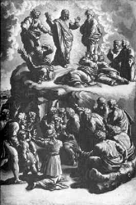 Doch hierüber vereinigte man sich ebensowenig als über das herrliche Bild der Transfiguration, welches man in dem zunächst gelegenen Kloster gleich darauf anzustaunen Gelegenheit fand. Da war denn des Redens viel; der stillere Teil jedoch ärgerte sich, den alten Tadel von doppelter Handlung wiederholt zu sehen. Es ist aber nicht anders in der Welt, als daß eine wertlose Münze neben einer gehaltigen auch immer eine gewisse Art von Kurs behält, besonders da, wo man in der Kürze aus einem Handel zu scheiden und ohne viel Überlegung und Zaudern gewisse Differenzen auszugleichen gedenkt. Wundersam bleibt es indes immer, daß man an der großen Einheit einer solchen Konzeption jemals hat mäkeln dürfen. In Abwesenheit des Herren stellen trostlose Eltern einen besessenen Knaben den Jüngern des Heiligen dar; sie mögen schon Versuche gemacht haben, den Geist zu bannen; man hat sogar ein Buch aufgeschlagen, um zu forschen, ob nicht etwa eine überlieferte Formel gegen dieses Übel wirksam könne gefunden werden; aber vergebens. In diesem Augenblick erscheint der einzig Kräftige, und zwar verklärt, anerkannt von seinen großen Vorfahren, eilig deutet man hinauf nach solcher Vision als der einzigen Quelle des Heils. Wie will man nun das Obere und Untere trennen? Beides ist eins: unten das Leidende, Bedürftige, oben das Wirksame, Hülfreiche, beides aufeinander sich beziehend, ineinander einwirkend. Läßt sich denn, um den Sinn auf eine andere Weise auszusprechen, ein ideeller Bezug aufs Wirkliche von diesem lostrennen?