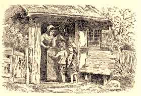 Am frühen Morgen kam die Frau und holte die Kinder aus dem Bette. Sie erhielten ihr Stückchen Brot, das war aber noch kleiner als das vorigemal. Auf dem Wege nach dem Wald bröckelte es Hänsel in der Tasche, stand oft still und warf ein Bröcklein auf die Erde. "Hänsel, was stehst du und guckst dich um ?" sagte der Vater, "geh deiner Wege !" "Ich sehe nach meinem Täubchen, das sitzt auf dem Dache und will mir Ade sagen", antwortete Hänsel. "Narr", sagte die Frau, "das ist dein Täubchen nicht, das ist die Morgensonne, die auf den Schornstein oben scheint." Hänsel aber warf nach und nach alle Bröcklein auf den Weg.