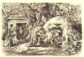 Früh morgens mußte Gretel heraus, den Kessel mit Wasser aufhängen und Feuer anzünden. "Erst wollen wir backen" sagte die Alte, "ich habe den Backofen schon eingeheizt und den Teig geknetet." Sie stieß das arme Gretel hinaus zu dem Backofen, aus dem die Feuerflammen schon herausschlugen "Kriech hinein", sagte die Hexe, "und sieh zu, ob recht eingeheizt ist, damit wir das Brot hineinschieben können" Und wenn Gretel darin war, wollte sie den Ofen zumachen und Gretel sollte darin braten, und dann wollte sie's aufessen. Aber Gretel merkte, was sie im Sinn hatte, und sprach "Ich weiß nicht, wie ich's machen soll; wie komm ich da hinein ?" "Dumme Gans", sagte die Alte, "die Öffnung ist groß genug, siehst du wohl, ich könnte selbst hinein", krabbelte heran und steckte den Kopf in den Backofen. Da gab ihr Gretel einen Stoß, daß sie weit hineinfuhr, machte die eiserne Tür zu und schob den Riegel vor. Hu ! Da fing sie an zu heulen, ganz grauselich; aber Gretel lief fort, und die gottlose Hexe mußte elendiglich verbrennen.