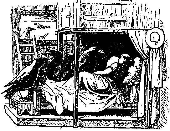 Auf einmal hörte es in der Luft ein Geschwirr und ein Geweh, da sprach das Zwerglein 'jetzt kommen die Herren Raben heim geflogen.' Da kamen sie, wollten essen und trinken, und suchten ihre Tellerchen und Becherchen. Da sprach einer nach dem andern 'wer hat von meinem Tellerchen gegessen? wer hat aus meinem Becherchen getrunken? das ist eines Menschen Mund gewesen.' Und wie der siebente auf den Grund des Bechers kam, rollte ihm das Ringlein entgegen. Da sah er es an und erkannte, daß es ein Ring von Vater und Mutter war, und sprach 'Gott gebe, unser Schwesterlein wäre da, so wären wir erlöst.' Wie das Mädchen, das hinter der Türe stand und lauschte, den Wunsch hörte, so trat es hervor, und da bekamen alle die Raben ihre menschliche Gestalt wieder. Und sie herzten und küßten einander, und zogen fröhlich heim.