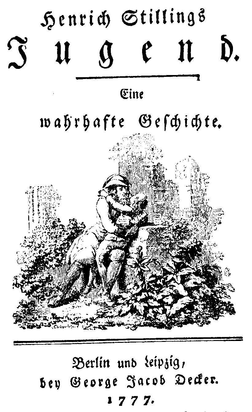 Unten am nördlichen Berge, der Geisenberg genannt, der wie ein Zuckerhut gegen die Wolken steigt, und auf dessen Spitze Ruinen eines alten Schlosses liegen, steht ein Haus, worinnen Stillings Eltern und Voreltern gewohnt haben.