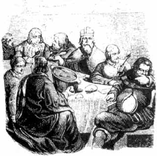 Als man Wasser genommen und sich zu Tisch gesetzt hatte und man jetzt anfing aufzutragen, da ward fürs Erste aufgesetzt eine Schüssel voll Karpfen, mit dem Löffel zu einem Brei gerührt; darnach ward aufgesetzt eine andere Platte voller Karpfen, auf eine andere Manier zugerichtet, nämlich mit der Brühe. Da dann der Schultheiß zum Kaiser sagte: »Er sollte nur tapfer in die Brühe tunken: wenn nicht genug da sei, müsse man mehr anrichten, denn sie hätten noch einen halben Kübel voll behalten.«