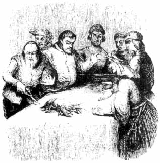 Die Schildbürger wußten jetzt eben so viel als vorher, und als ihn Einer angreifen wollte, erwischte ihn der Krebs mit der Schere dermaßen, daß er anfing, um Hülfe zu rufen und zu schreien: Es ist ein Mörder, ein Mörder! Als Solches die Andern vernommen, hatten sie schon genug: besetzten darum alsobald gleich auf der Stelle ohne Verzug von Stund an eilends allda am selbigen Ort auf dem Platz, da der Bauer gebissen worden, das Gericht und ließen ein Urtheil über den Krebs ergehen, das lautete ohngefähr folgendermaßen: Sintemal Niemand wisse, was dieses für ein Thier sei, sich jetzt aber befinde, dieweil es sie betrogen, indem es sich für einen Schneider ausgegeben und es doch nicht sei, daß es ein leutebetrügendes und schädliches Thier sei, ja ein Mörder: also erkennten sie, daß es solle gerichtet werden, als ein Leutebetrüger und Mörder, mit dem Wasser und was dazu gehört.