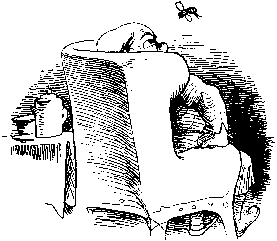 | Da kommt die Fliege mit Gebrumm Und surrt ihm vor dem Ohr herum. |