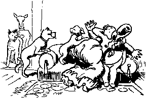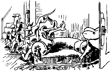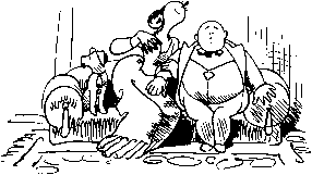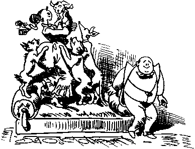 | Knopp hat keinen Sinn dafür. Er entfernt sich durch die Tür. - Schnell verläßt er diesen Ort Und begibt sich weiter fort. |