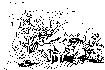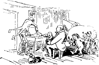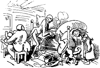| Herzlich wird er aufgenommen. Plünne rufet: »Ei, willkommen! Gleich besorg ich dir zu essen, |