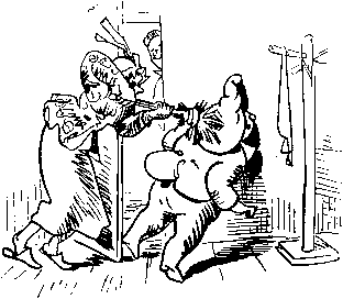 | Schrupp! - Wie Knopp hineingekommen, Wird er an die Wand geklommen. »Wart!« ruft Mückens Ehgemahl - »Warte, Lump, schon wieder mal!?« |