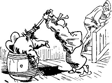 | Bums! Er fällt in einen Kübel, Angefüllt mit dem, was übel. |