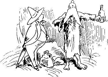 | Und aus Knoppen seiner Tasche Hebt er ernst die Wanderflasche. |