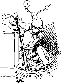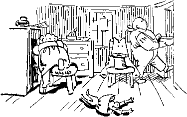 | Achherrje! Es geht klabum! Julchen schwebt; der Stuhl fällt um. |