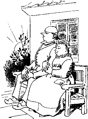| Sorgenlos und stillvergnügt Kurz vor ihrem Abendschmause Noch ein wenig vor dem Hause, Denn der Tag war ein gelinder, Und erwarten ihre Kinder. |
